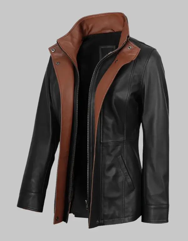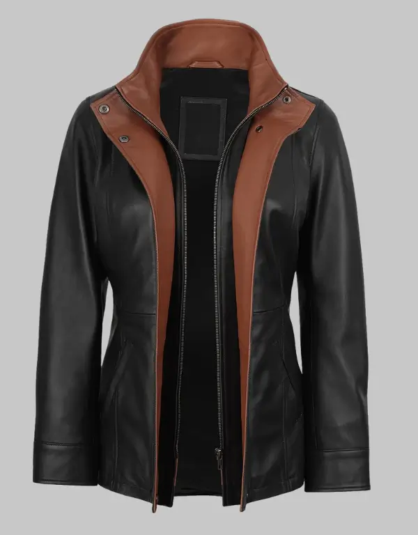 Brown side panels bring a unique contrast to the classic black body, adding definition and a chic contemporary twist. With two side pockets for everyday essentials and an extra interior pocket for your phone, this jacket is both functional and fashionable.