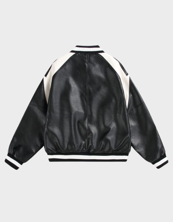 Upgrade your streetwear and casual wardrobe with this Unisex Black & White Varsity Leather Bomber Jacket, designed for a bold yet timeless look. Crafted from premium faux leather with a smooth grain finish, this jacket delivers the classic varsity aesthetic with a modern edge. The contrasting white panels on the shoulders and pockets create a sharp, sporty silhouette that stands out effortlessly.