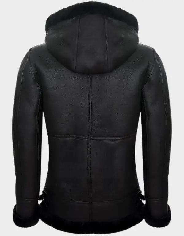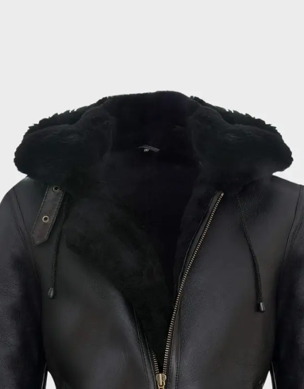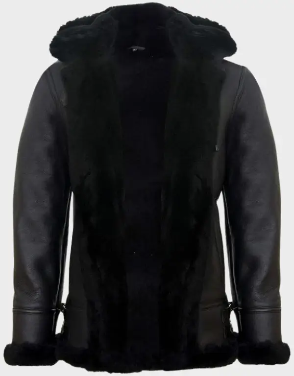 Inspired by the legendary B3 bomber design, this shearling leather jacket mens features a detachable hood for versatile styling — wear it for a rugged, casual look or remove it for a more classic aviator vibe. The heavy-duty front zipper, adjustable side buckles, and rolled shearling cuffs reflect meticulous craftsmanship and attention to detail. Whether you’re dressing for a night out, a flight-inspired look, or simply winter layering, this brown shearling jacket alternative in sleek black makes a bold, masculine statement.