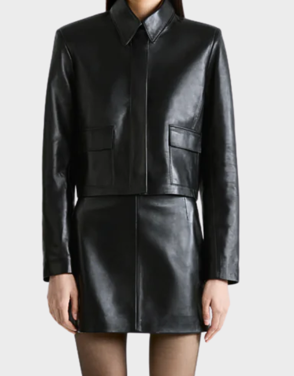 A modern take on a timeless silhouette, the Bleeker jacket is crafted from lightweight grained lambskin in classic black. It features a sharp spread collar and a concealed front zip closure that maintains a clean, minimal aesthetic. The boxy, cropped cut sits above the waist for a flattering, structured shape, complemented by lightly padded shoulders that add gentle volume. Two oversized front flap pockets offer functionality without compromising on design. Fully lined in soft twill, the interior feels as refined as the exterior. Long sleeves fall straight, finishing the look with clean edges.